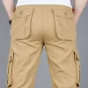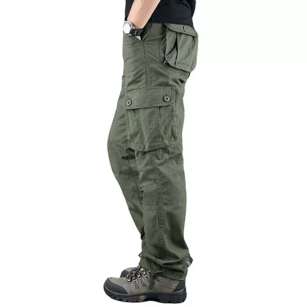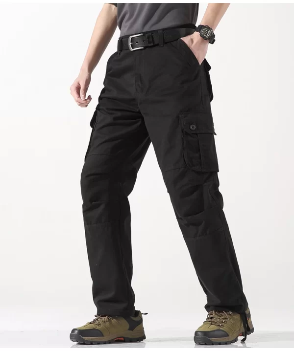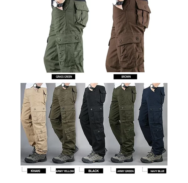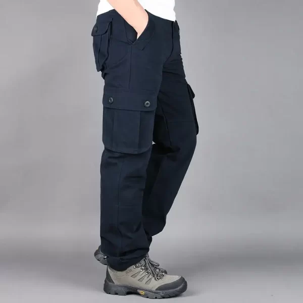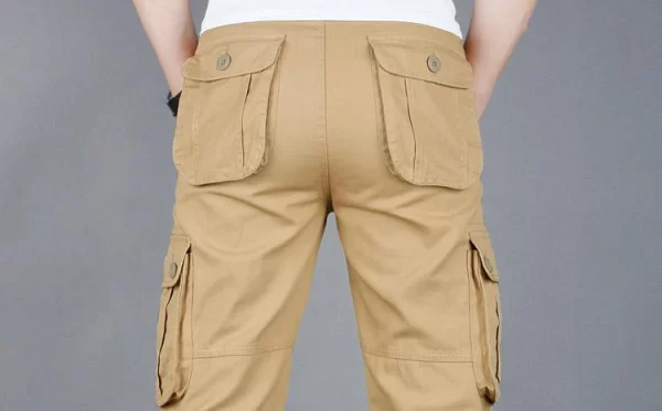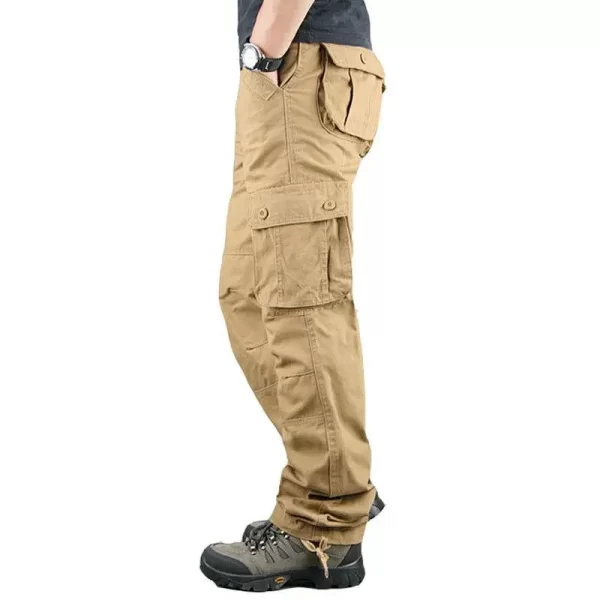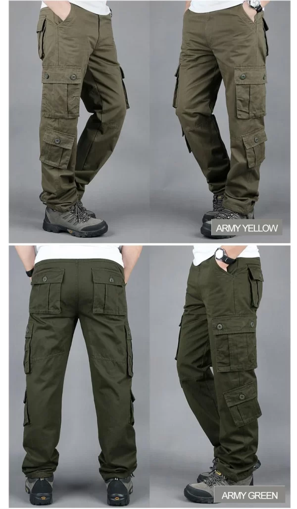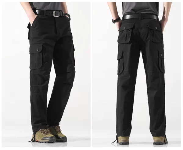 These Men Cotton Cargo Pants offer an outdoor loose fit. They are midweight and perfect for casual scenes. The cotton material ensures comfort, and the cargo style with multiple pockets adds functionality. The mid waist and flat front style give a classic look. They are suitable for spring and autumn.