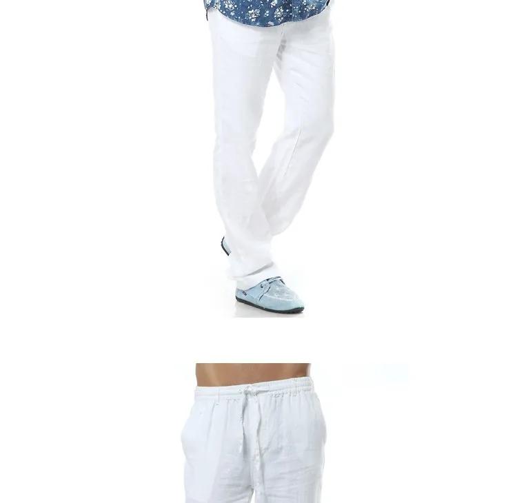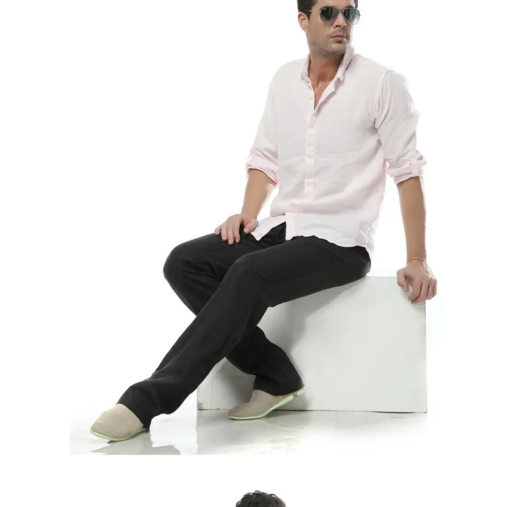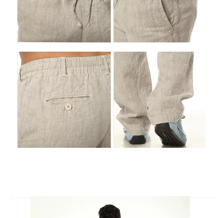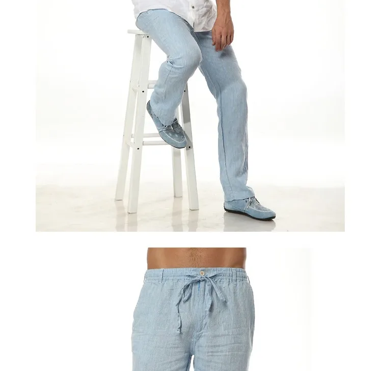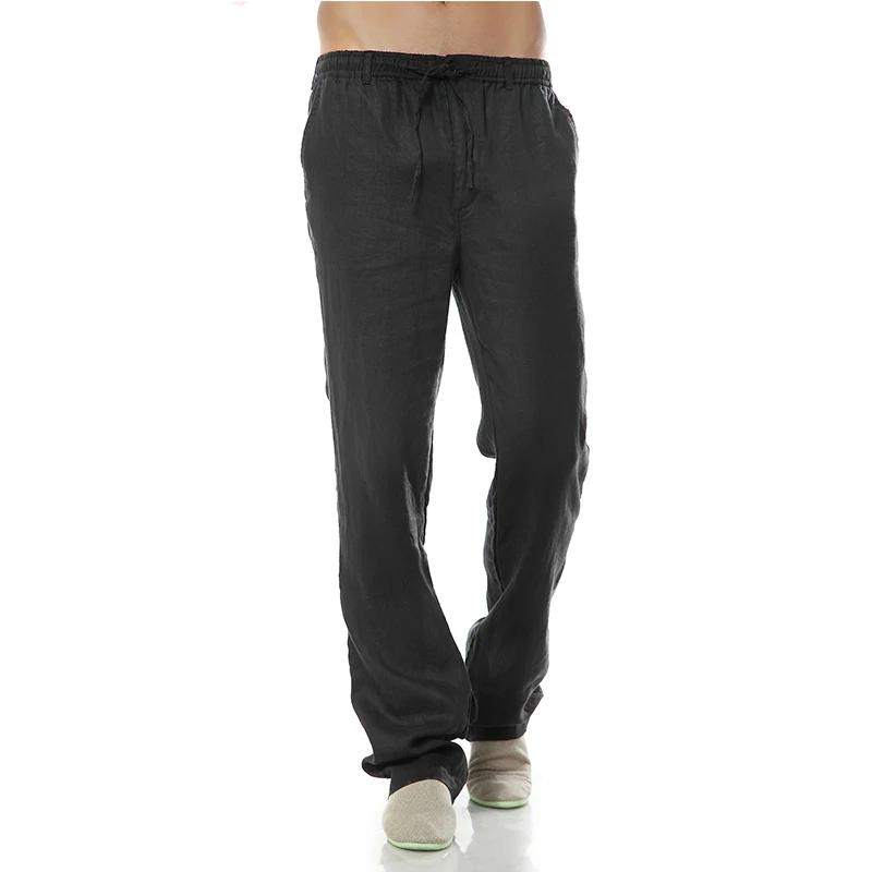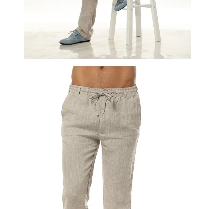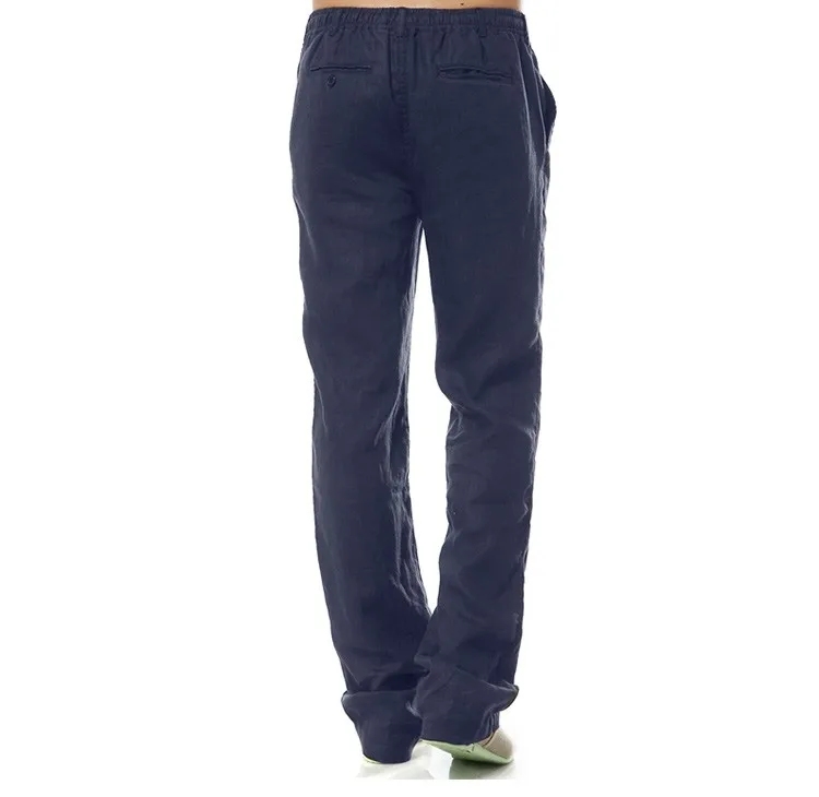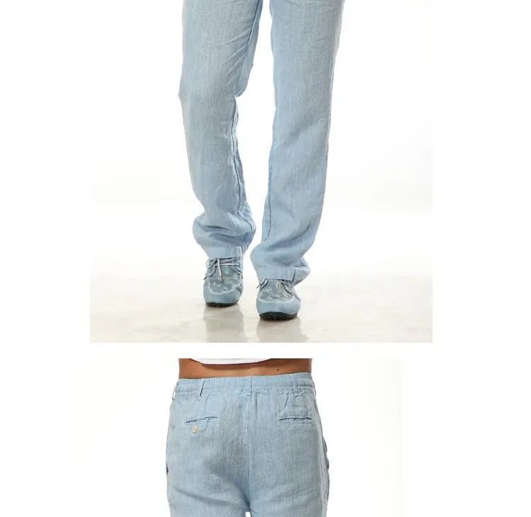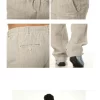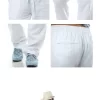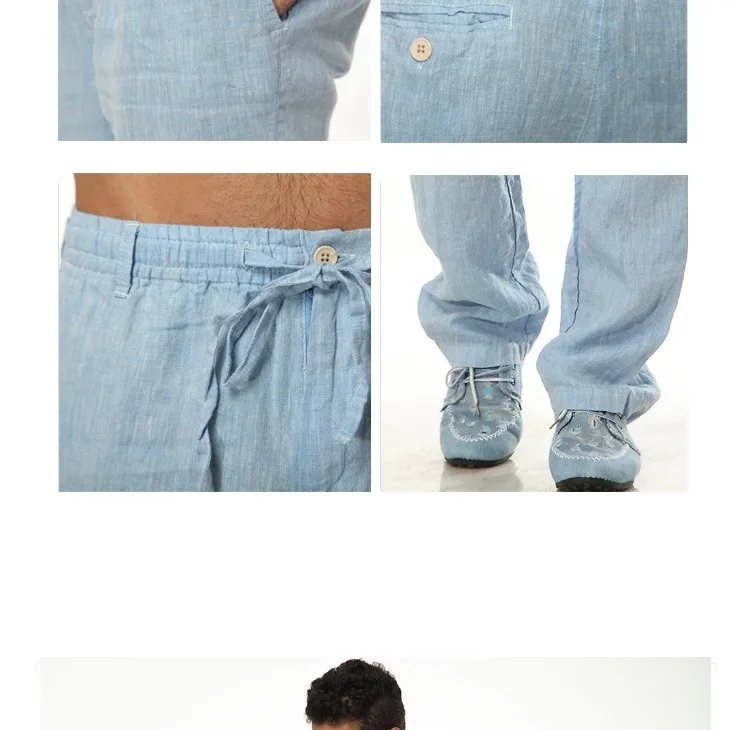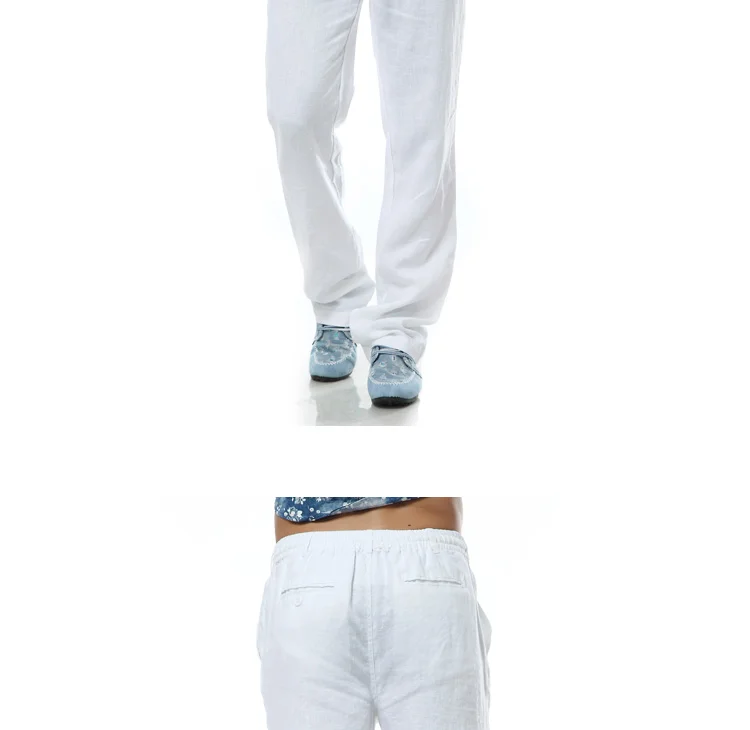 These men’s casual linen pants offer a loose fit for maximum comfort. Made from 100% linen, they are lightweight and suitable for all seasons. The elastic waist ensures a snug fit, while the flat front style gives a clean look. Perfect for casual outings, these pants come in various colors and have ribbon decorations for a stylish touch.