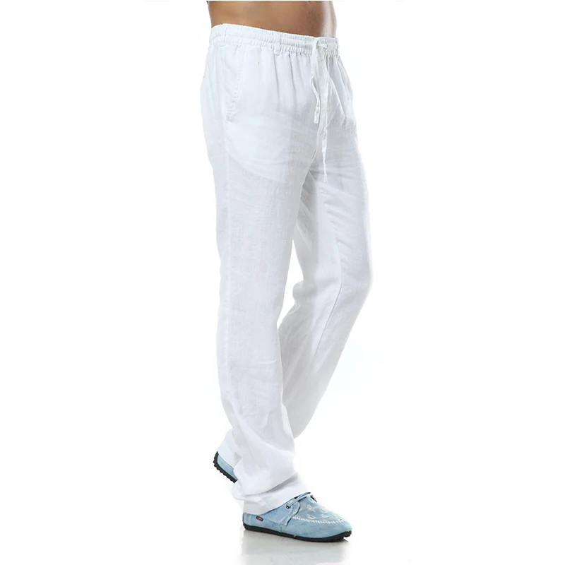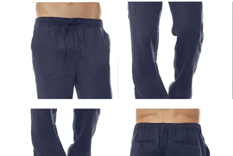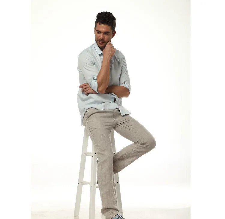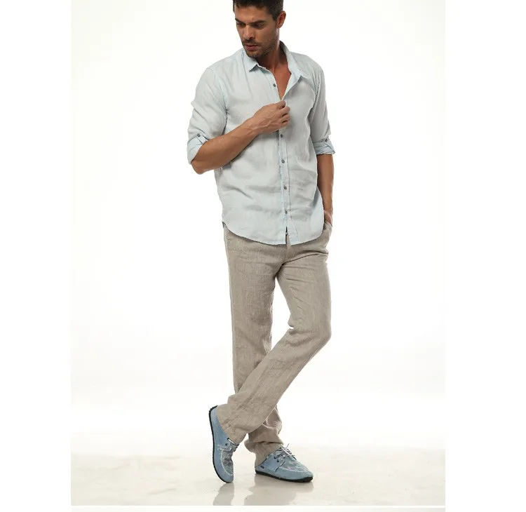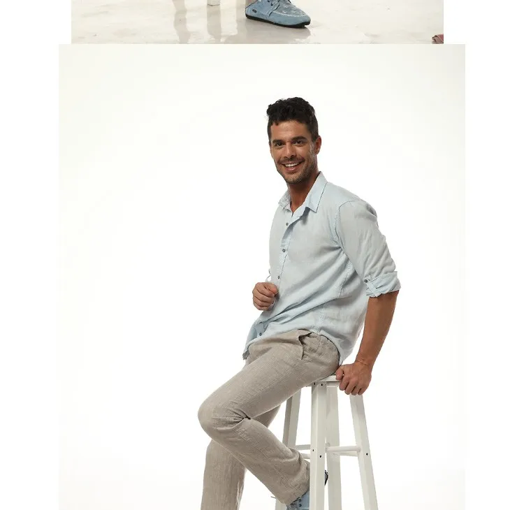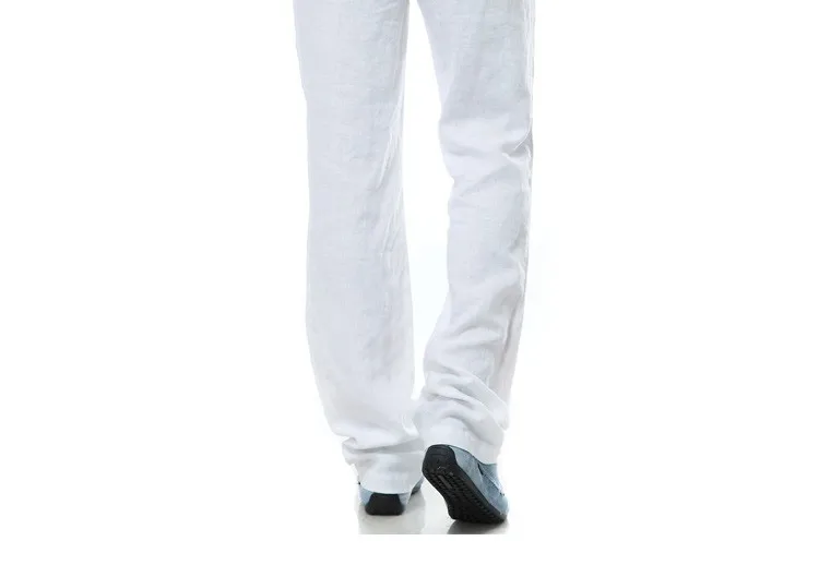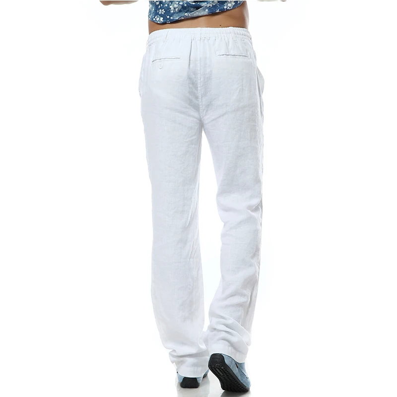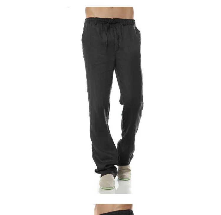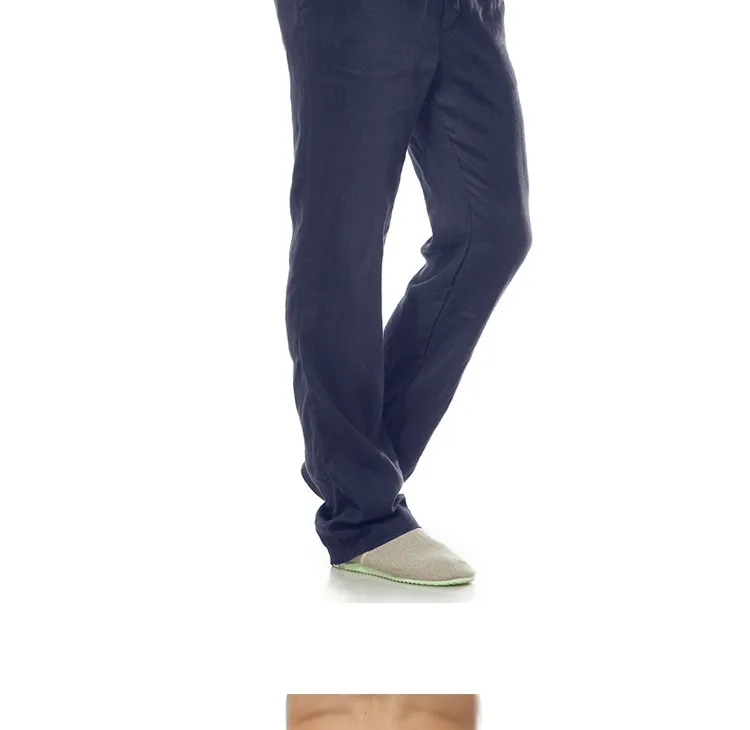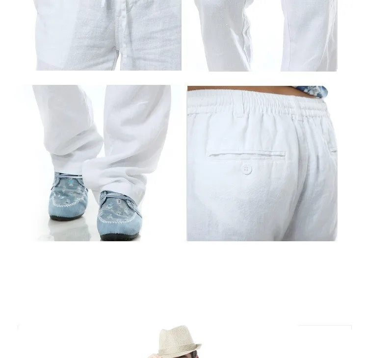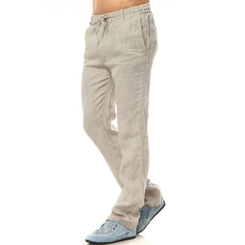 These men’s casual linen pants offer a loose fit for maximum comfort. Made from 100% linen, they are lightweight and suitable for all seasons. The elastic waist ensures a snug fit, while the flat front style gives a clean look. Perfect for casual outings, these pants come in various colors and have ribbon decorations for a stylish touch.
