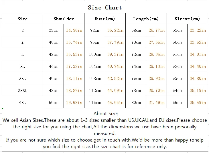 | Size | Shoulder (cm) | Bust (cm) | Length (cm) | Sleeve (cm) |