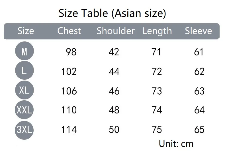 Size Chest (cm) Shoulder (cm) Length (cm) Sleeve (cm)