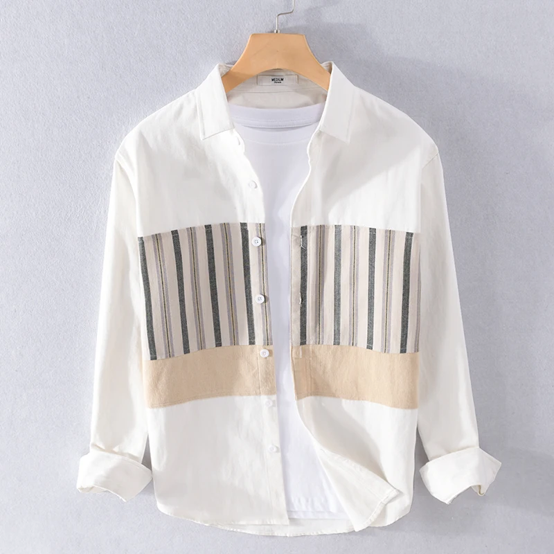 Mens Italian Beige Striped Long Sleeve Shirt Cotton Linen BreathableMens Italian Beige Striped Long Sleeve Shirt Cotton Linen Breathable