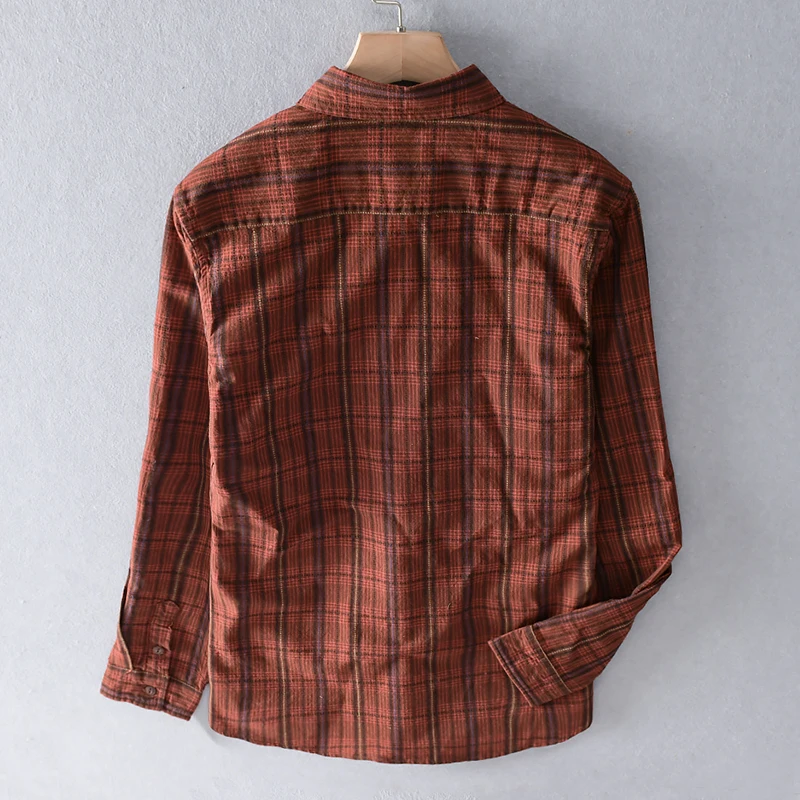 Mens Retro Plaid Long Sleeve Linen Cotton Casual Shirt Stand Collar Single Breasted