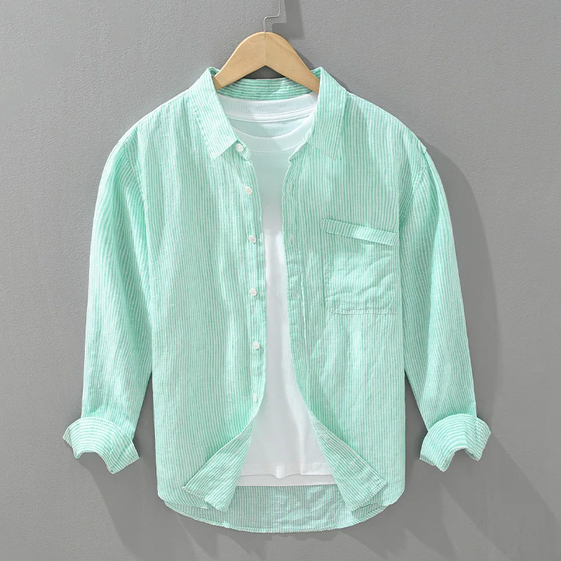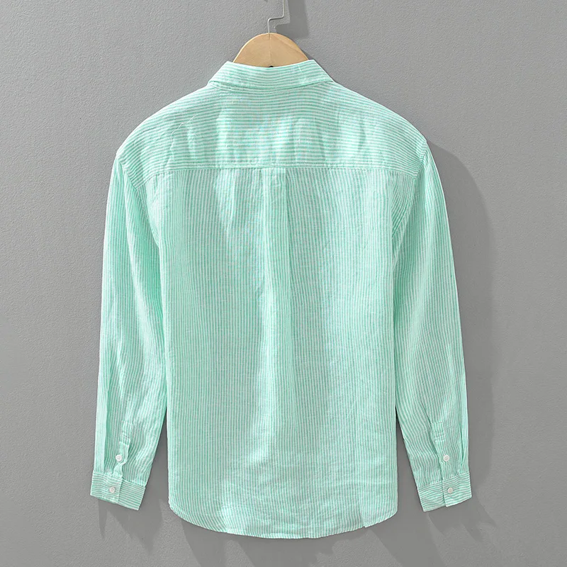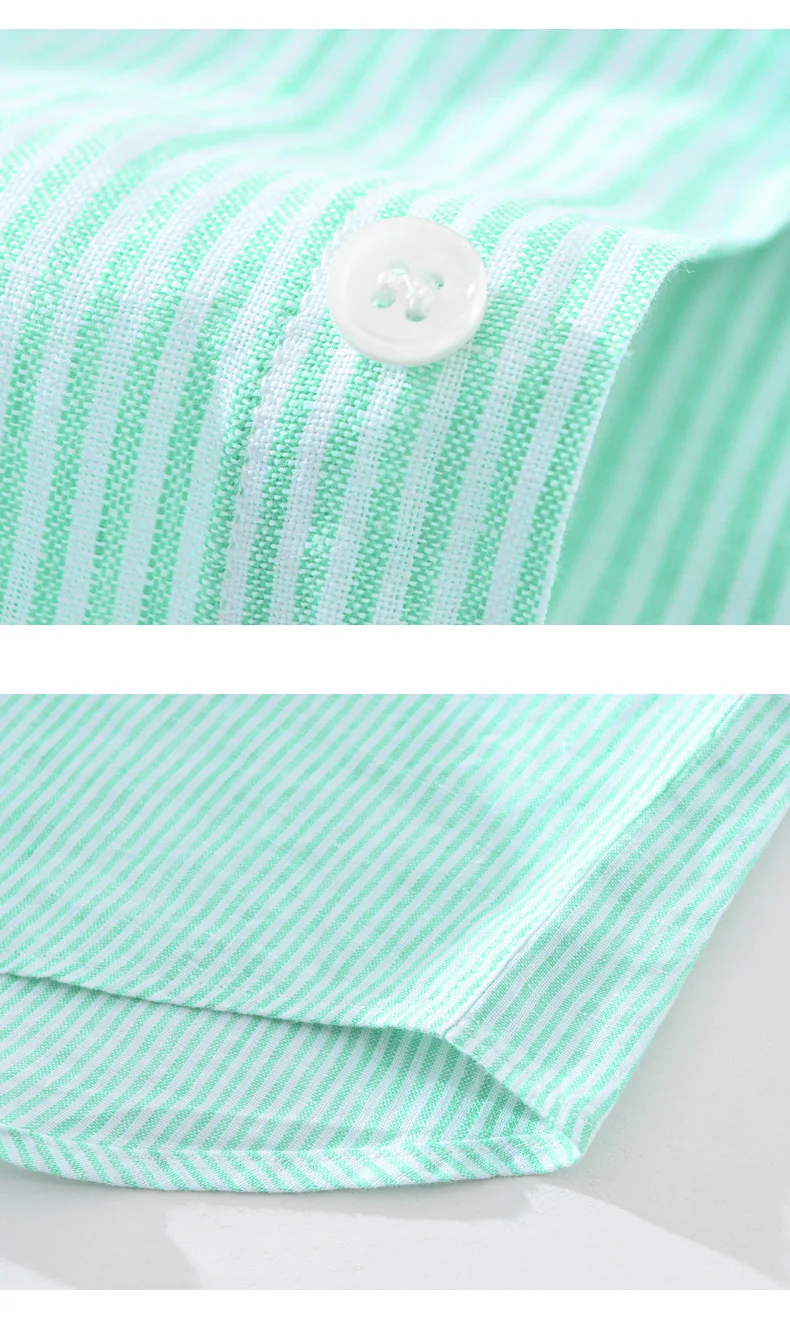 Mens Linen Green Blue Striped Oversize Casual Long Sleeve Shirt