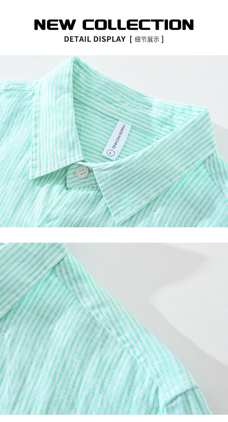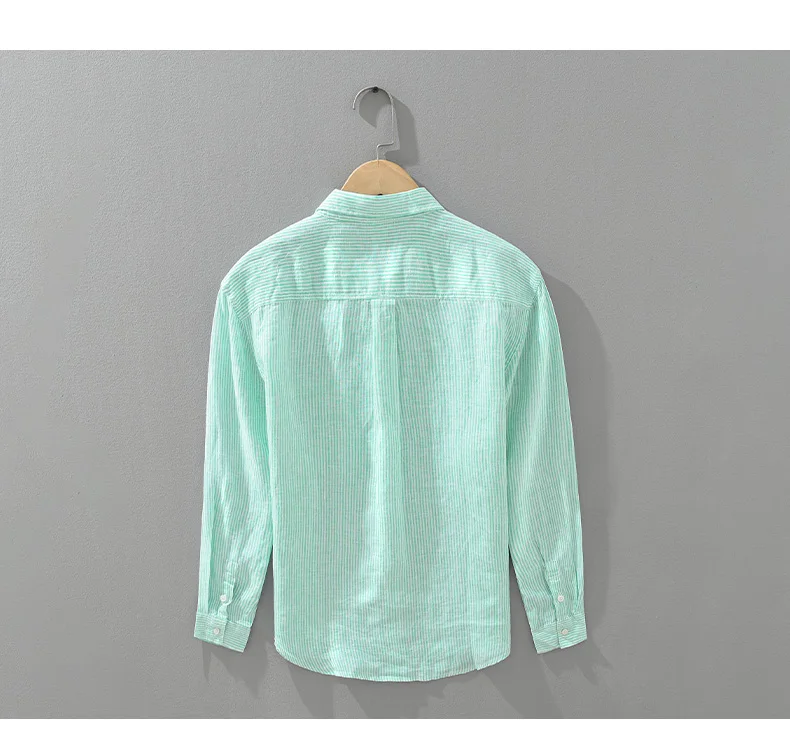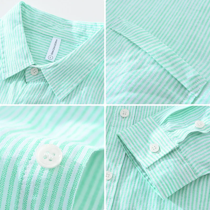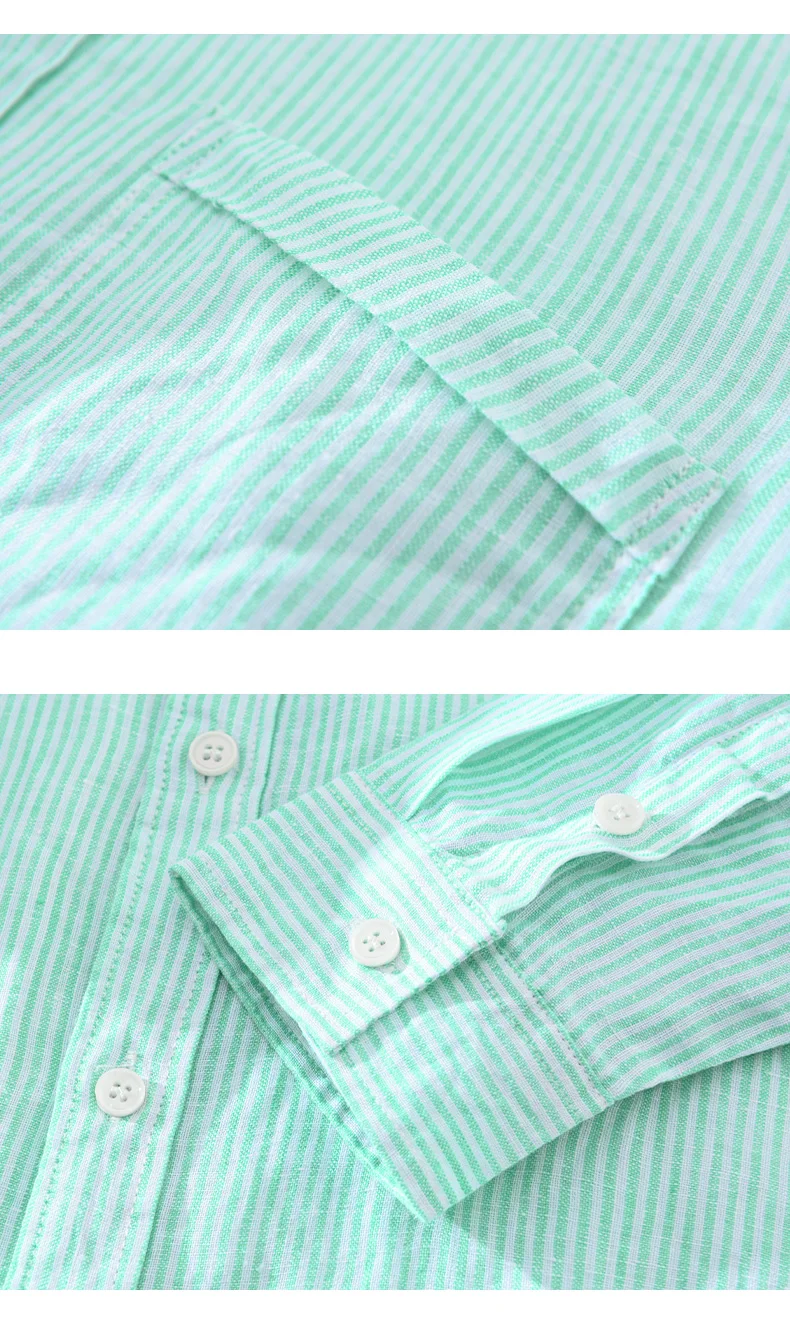 This men’s Linen Green Blue Striped Oversize Casual Long Sleeve Shirt uses 100% linen fabric for breathability and comfort, suitable for all four seasons. It features a turn – down collar, single – breasted closure, and an oversize fit with regular full – length sleeves. The striped pattern adds a trendy touch, making it perfect for daily wear, whether you’re hanging out or running errands.