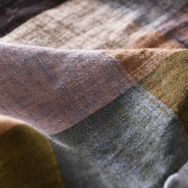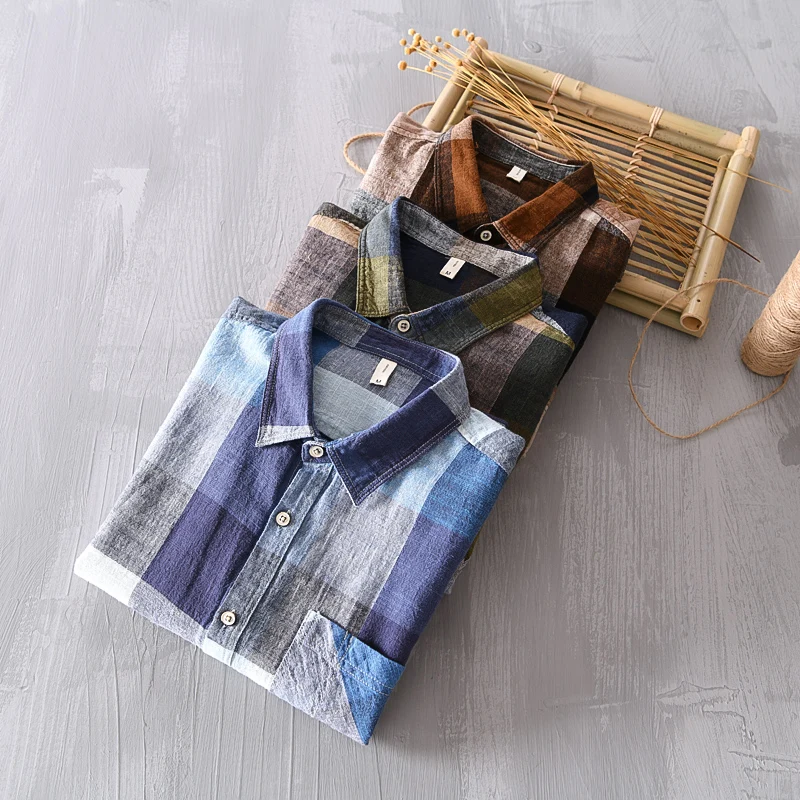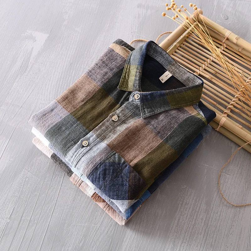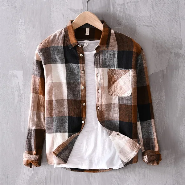 Mens Plaid Long Sleeve Cotton Linen Breathable Casual Office Four Seasons Shirt