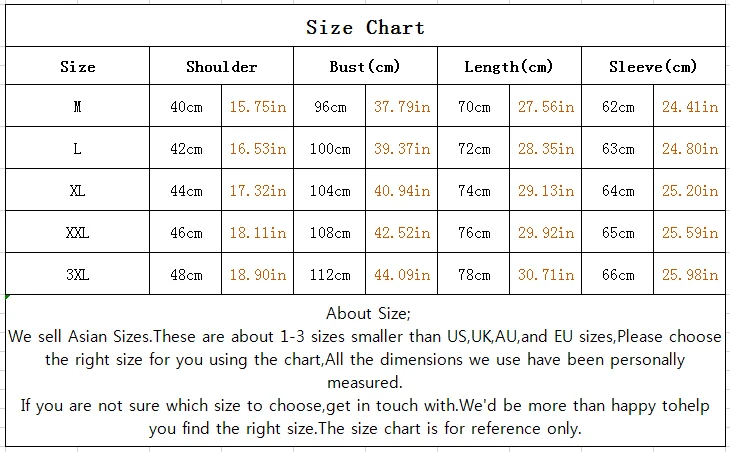 | Size | Shoulder (cm) | Bust (cm) | Length (cm) | Sleeve (cm) |