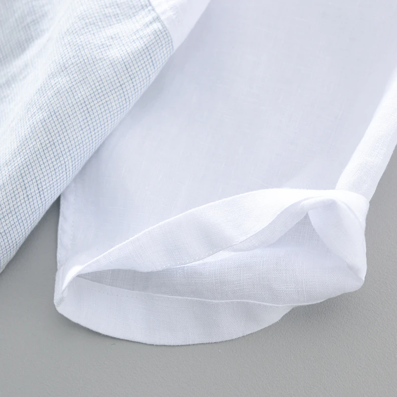 Mens Pure Linen Plaid Patchwork Short Sleeve Casual Summer Shirt