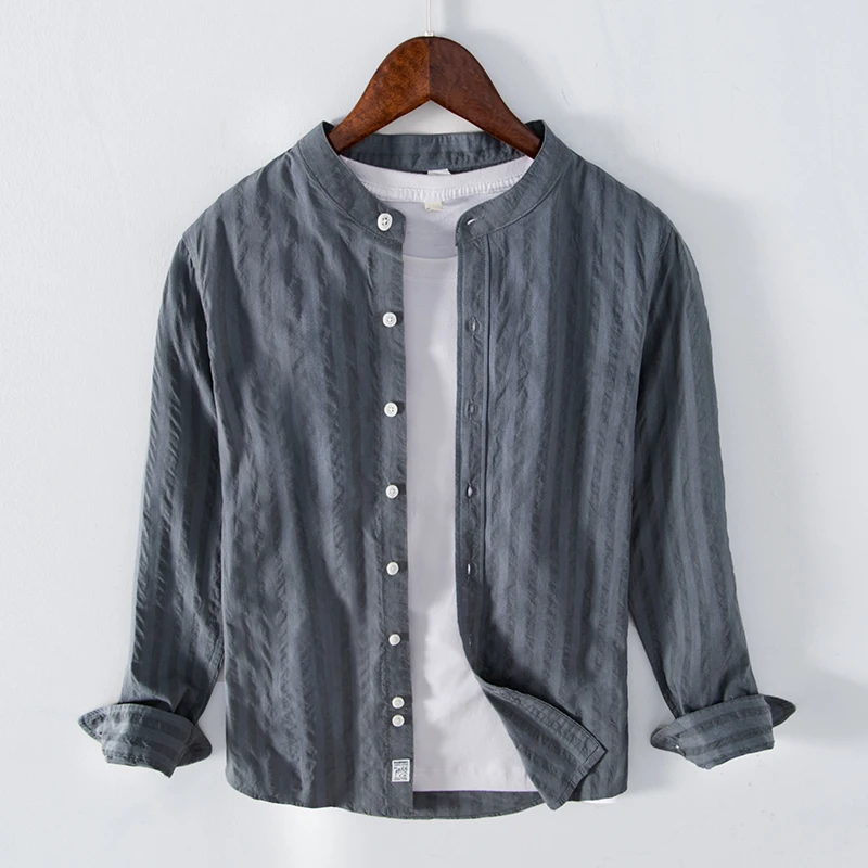 Mens Retro Striped Cotton Long Sleeve Stand Collar Casual Shirt