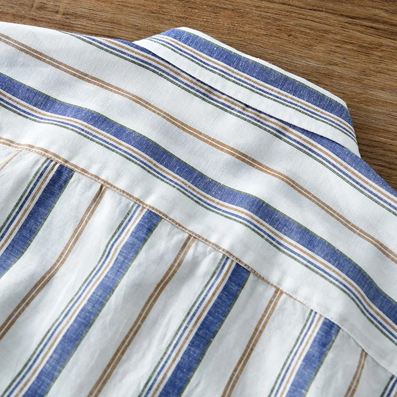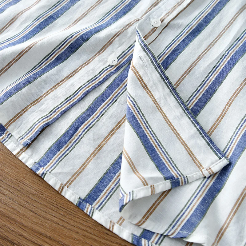 Mens Linen Long Sleeve Striped Casual Shirt Comfortable Turn Down Collar