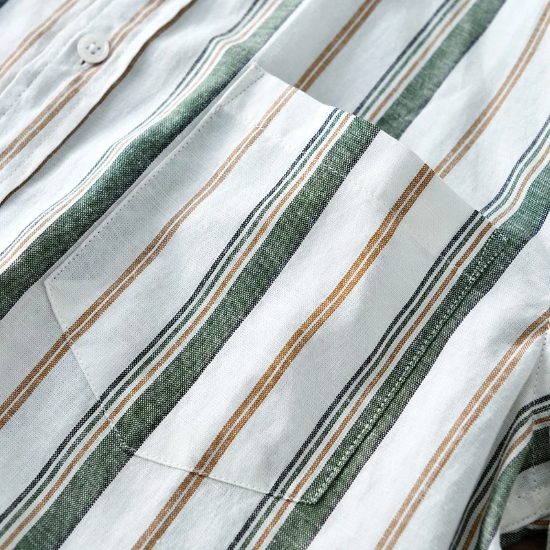 This men’s trendy striped long – sleeve casual shirt is made from a blend of 27% linen, 23% cotton, 25% bamboo fiber, and 25% polyester, ensuring breathability and comfort for year – round (four seasons) wear. It features a stand collar, full long sleeves, and a classic striped pattern. The single – breasted full – opening design and casual style make it perfect for daily casual scenes, like weekend outings or everyday looks. It comes in blue and green, with sizes from M to XXXL to fit different body types.